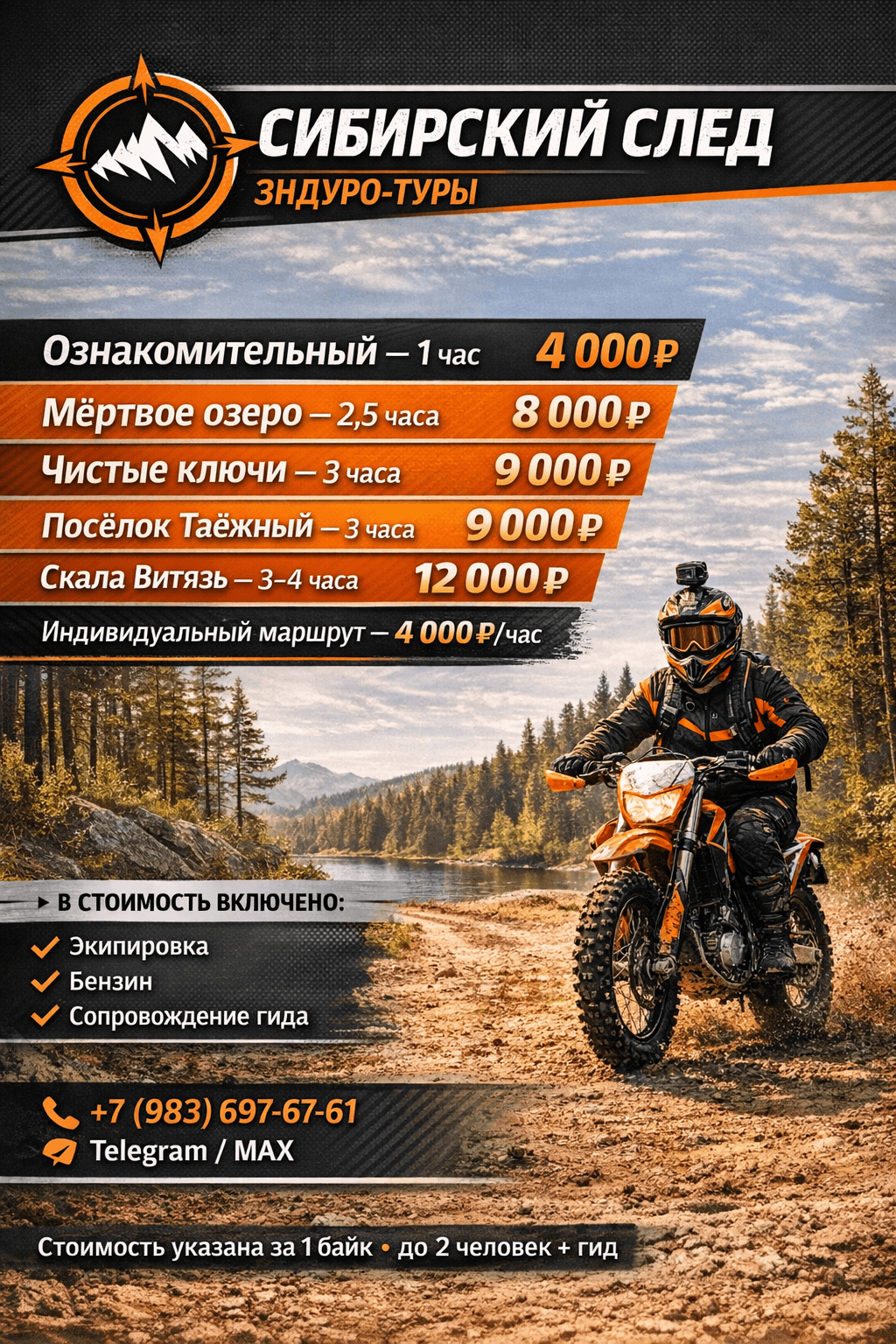 🔥 Что вас ждёт Мы проводим эндуро-туры разного уровня сложности — от новичков до уверенных райдеров. Маршруты проходят по живописным местам Иркутской области: леса, холмы, реки, грязевые участки, камни и настоящие эндуро-тропы. Технические участки и фановые треки Дикая природа без толп туристов Полное погружение в атмосферу эндуро Индивидуальный подход к каждому участнику